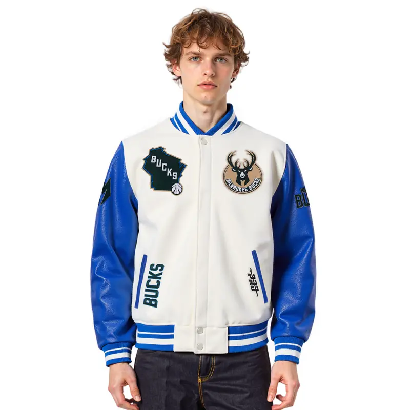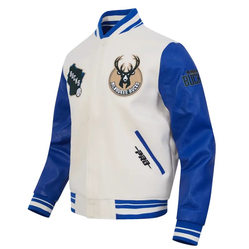 NBA MILWAUKEE BUCKS CITY EDITION 25-26 MEN’S RIB WOOL VARSITY JACKET (EGGSHELL\/ROYAL BLUE)