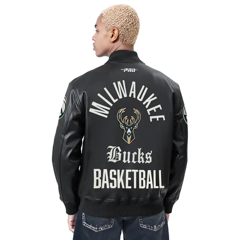 NBA MILWAUKEE BUCKS MODERN ORIGINALS MEN’S LEATHER VARSITY JACKET (JET BLACK)