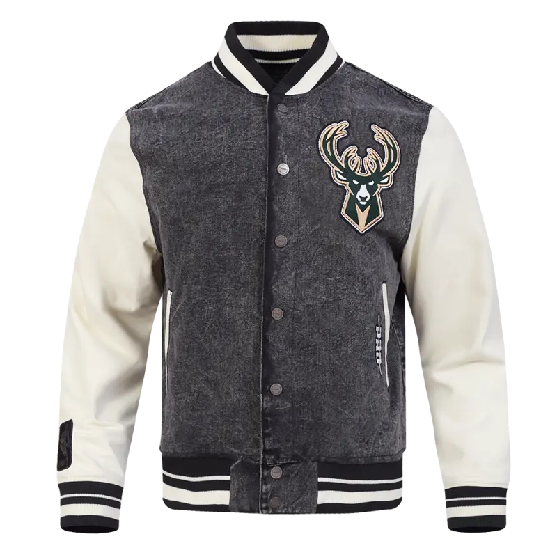 NBA MILWAUKEE BUCKS REBEL ATHLETICS MEN’S DENIM VARSITY JACKET (WASHED BLACK\/EGGSHELL)