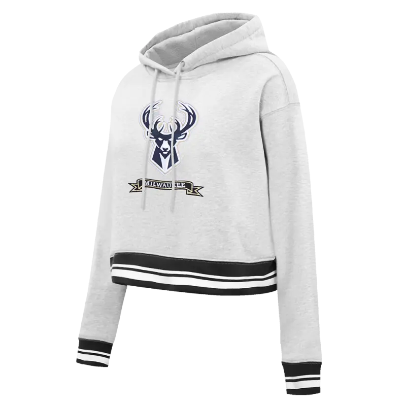 NBA MILWAUKEE BUCKS PRO PREP RIB FLEECE WOMEN’S CROPPED PULLOVER HOODIE (HEATHER GRAY\/BLACK)