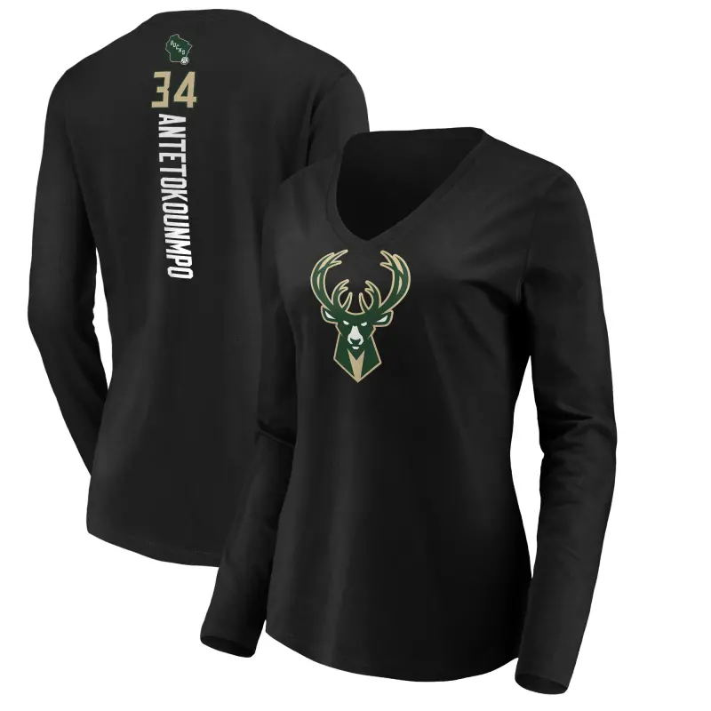 Women’s Milwaukee Bucks Giannis Antetokounmpo Black Playmaker Name & Number Long Sleeve V-Neck T-Shirt
