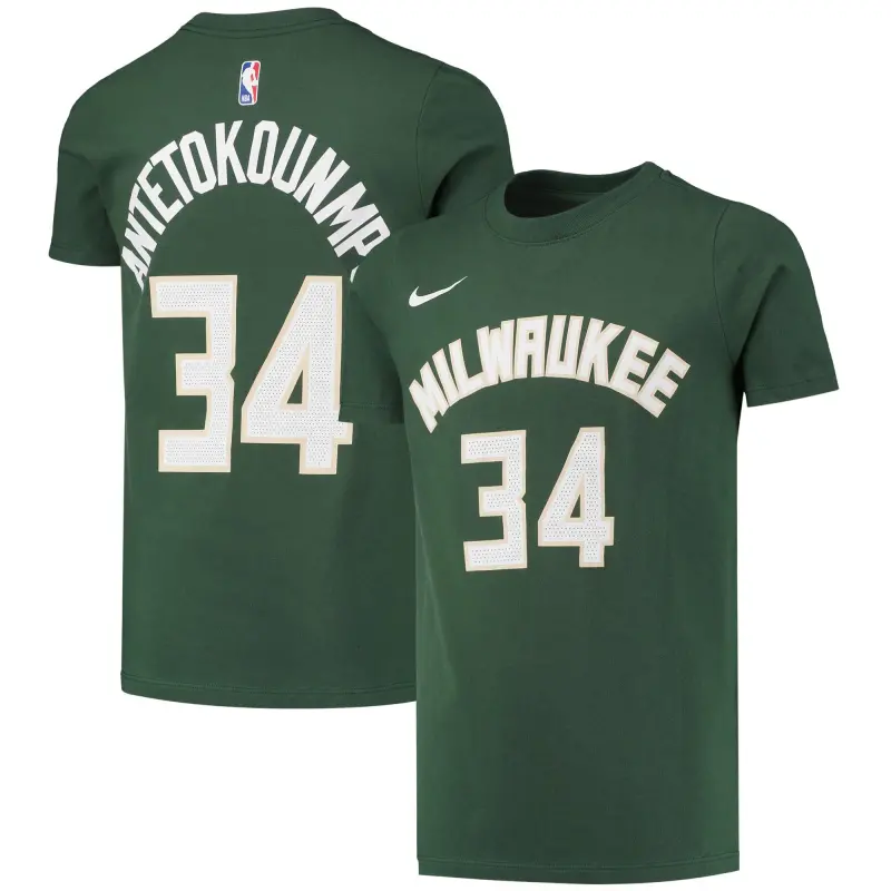 Youth Milwaukee Bucks Giannis Antetokounmpo Nike Hunter Green Logo Name & Number Performance T-Shirt