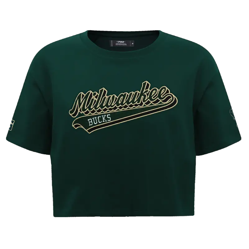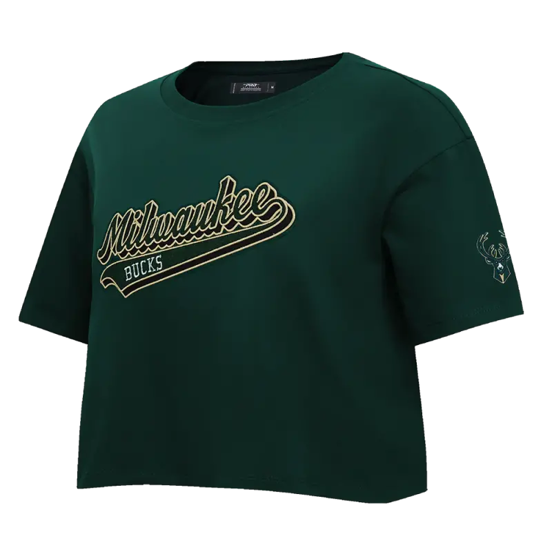 NBA MILWAUKEE BUCKS SCRIPT TAIL WOMEN’S SINGLE JERSEY BOXY TEE (FOREST GREEN)